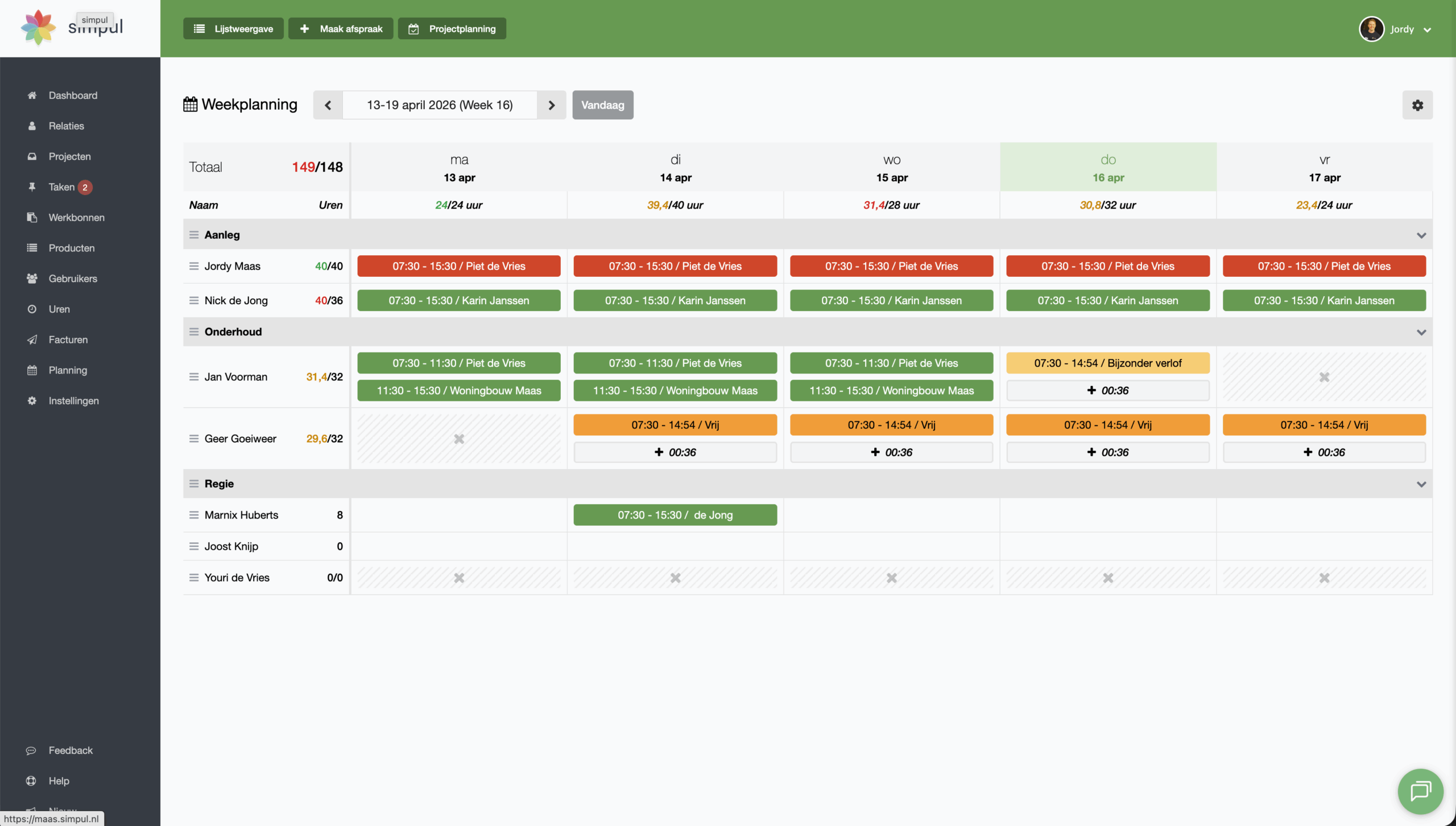 Binnen Simpul is het mogelijk om per medewerker een werkrooster vast te leggen met het juiste aantal uren per dag. Dit vormt een essentieel onderdeel van de weekplanning, aangezien hierbij rekening wordt gehouden met de beschikbare capaciteit per medewerker (per dag, per week en in totaal).